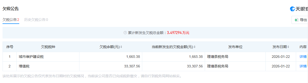 据天眼查显示,1月22日,丁真珍珠(丁真)名下个人独资企业四川小马少年文化传媒工作室新增2则欠税公告,累计欠税金额为3.4万余元,欠税税种为城市维护建设税、增值税。